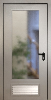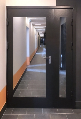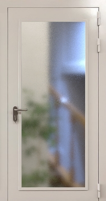 В основе конструкции остекленных дверей – сложногнутый профиль и листы с толщиной стали от 1,5 мм. Огнестойкий стеклопакет состоит из нескольких стекол с терморасширяющимся гелем, который при высокой температуре вспучивается и скрепляет их, препятствуя разрушению остекления. Согласно пожарным нормам, в комплектацию также входят уплотнители, противопожарные замки и доводчики.